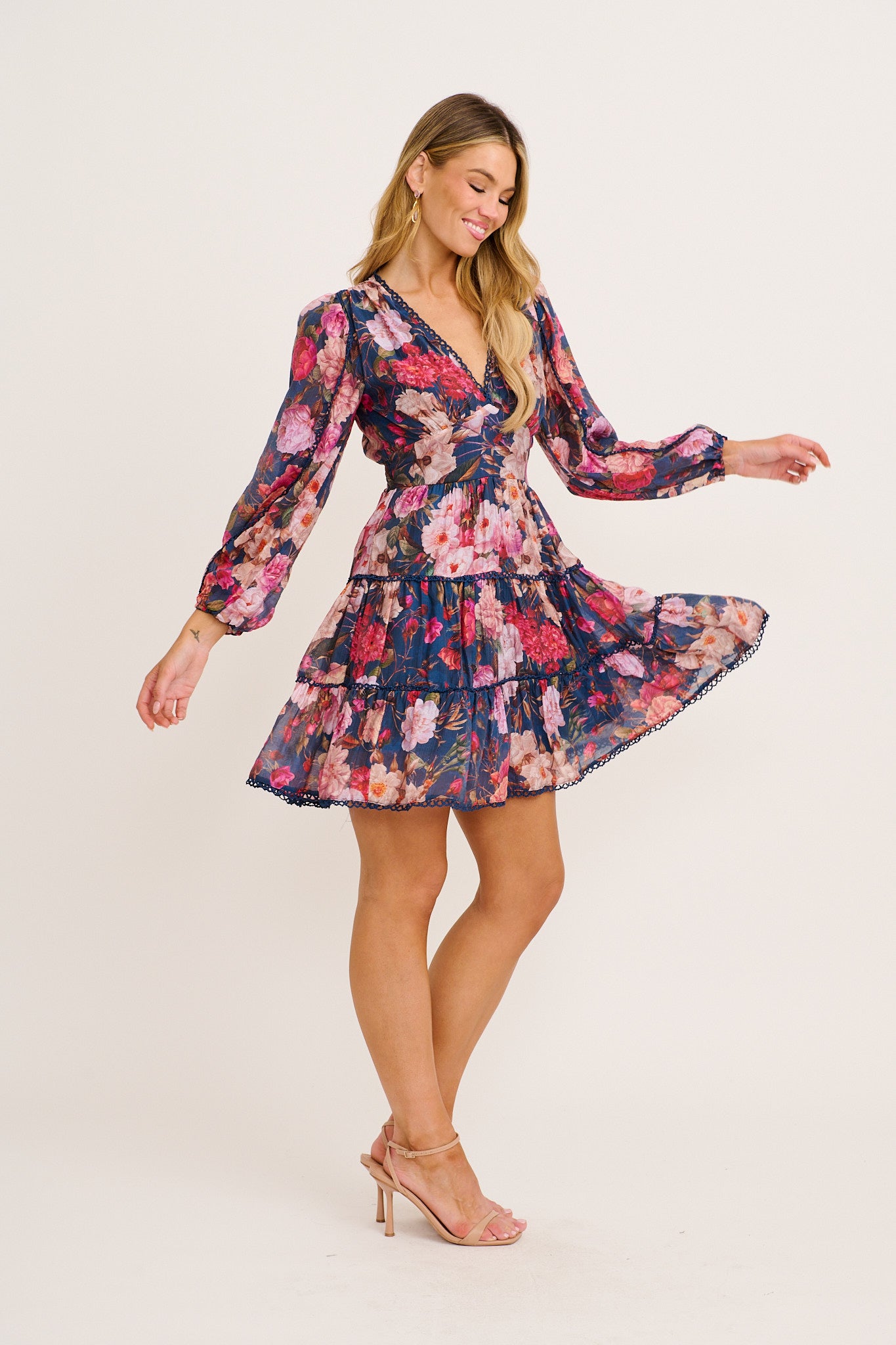 Crafted from lightweight breathable fabric, the design is lined through the bodice and skirt to ensure comfortable coverage while maintaining graceful movement. The navy base highlights the delicate blush floral print, creating a refined and romantic look.